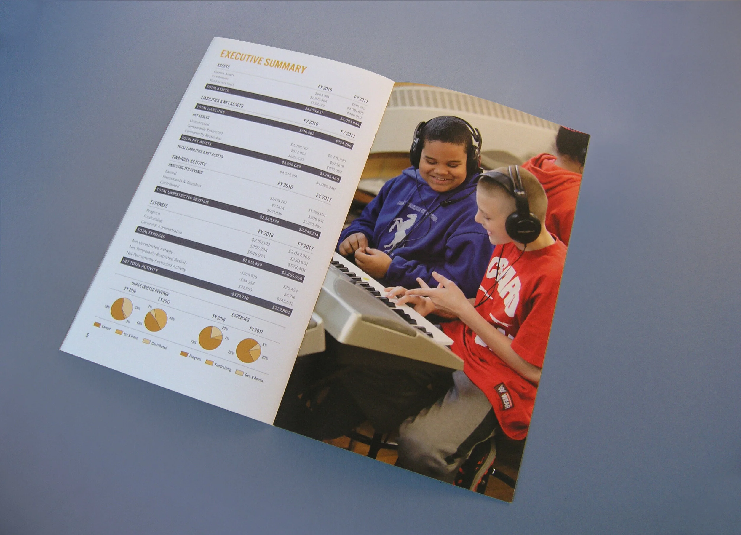 Direct mail annual report design for Community Music Center of Boston, an arts education nonprofit