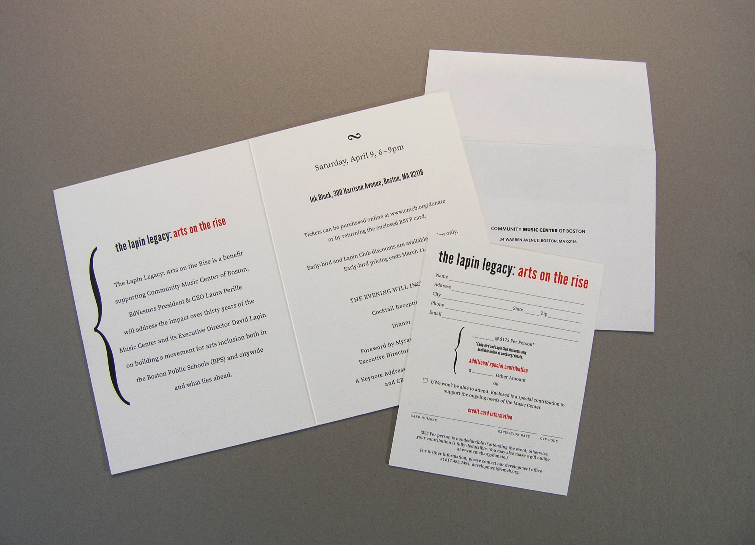 Direct mail invitation design for Community Music Center of Boston fundraising event